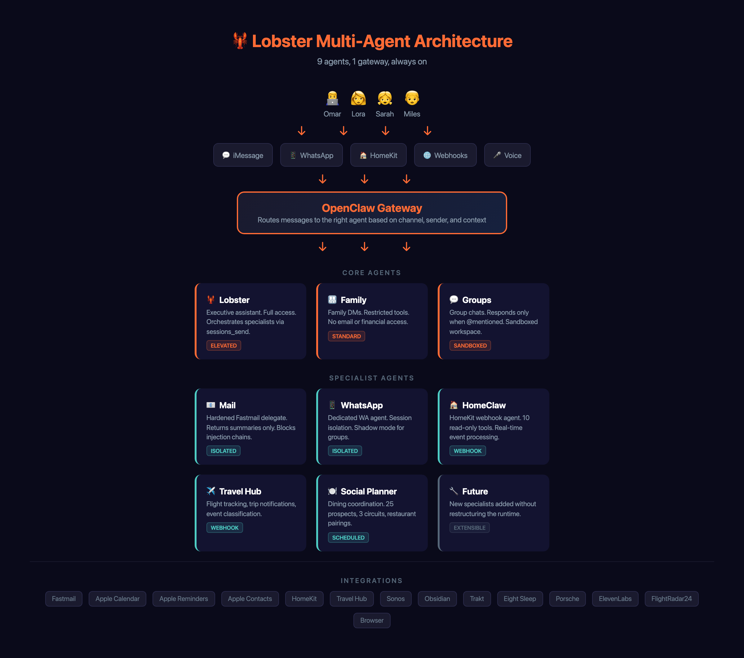 From three agents to nine. The original trio (main agent, family agent, groups agent) has been joined by six specialists. A dedicated mail agent that isolates all Fastmail access and returns structured summaries (never raw email bodies, to break prompt injection chains). A WhatsApp agent with its own session isolation. A HomeClaw webhook agent that processes HomeKit events in real time. A Travel Hub webhook agent for flight tracking and trip notifications. And a social planner agent that tracks 25 dining prospects across three social circuits, seeds itself with 24 months of calendar history, and coordinates outings with restaurant pairing suggestions.