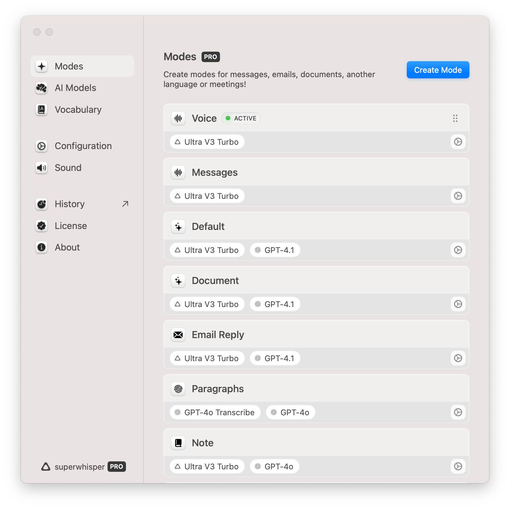 This is where Superwhisper really shines compared to basic transcription tools. You can choose from built-in modes such as pure voice transcription, tailored text formatting, or create your own custom modes with personalized AI instructions.
